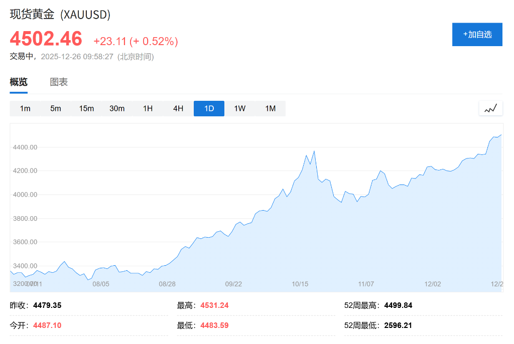 黄金价格则稳步回升,交投于每盎司4500美元上方,现报4502.46美元,最高涨至4530美元/盎司上方,再创历史新高。