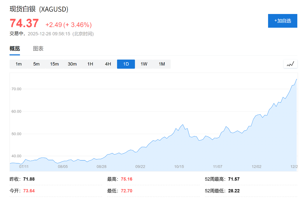 现货白银在周五录得连续第五个交易日上涨,现报74.37美元/盎司,最高突破75美元/盎司,日内涨超4.5%,续创历史新高。